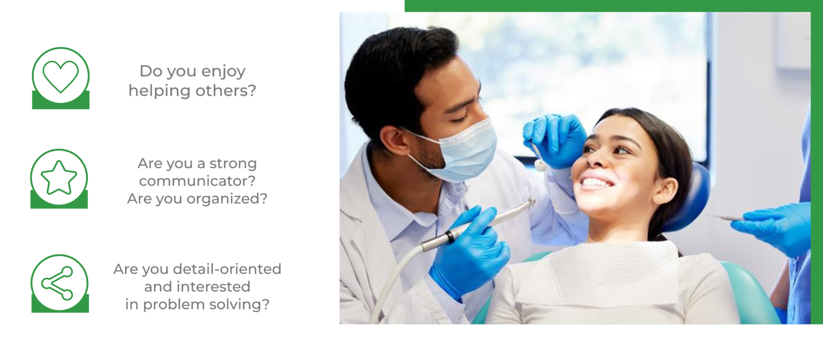 - Strong Communication Skills: Dental assistants play a vital role in interacting with patients, dentists, and team members every day. Clear and effective communication of treatment plans and important information is essential.