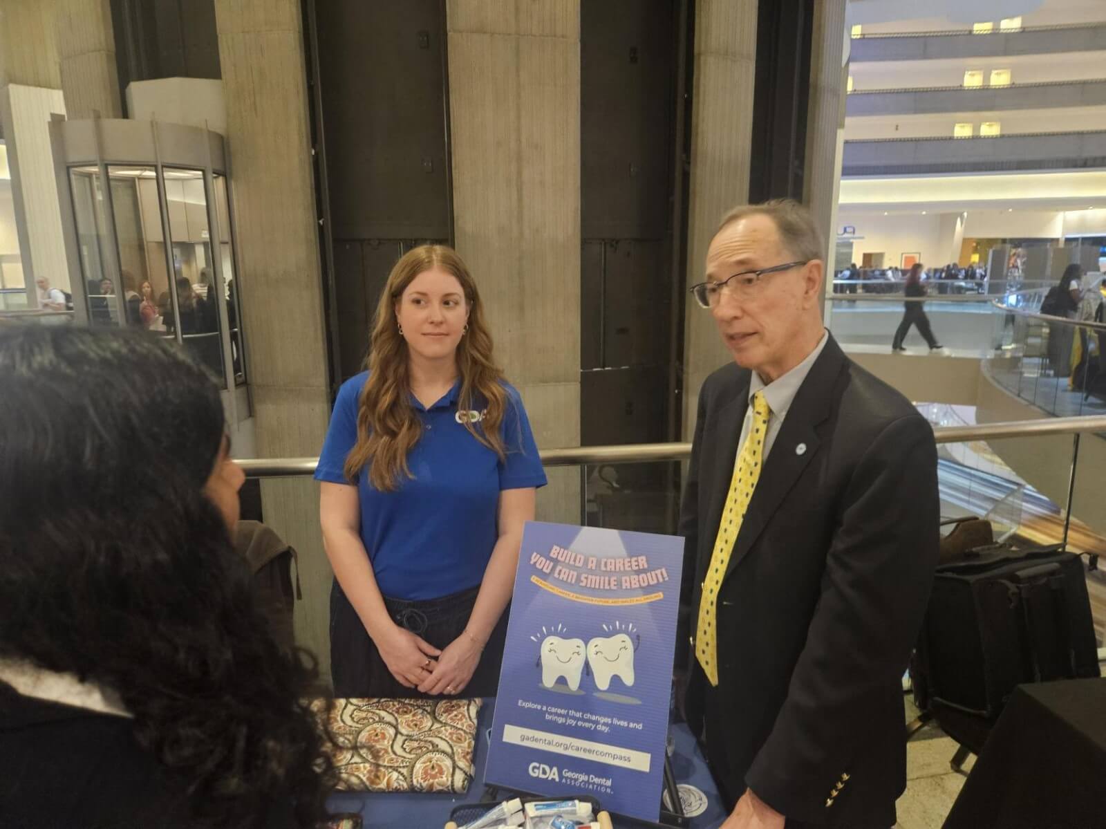 The anchor of GDA’s HOSA experience is always our booth, helmed by GDA’s own Shelby Naidoo and Stephanie DeLaHunt. This year’s booth was located right in the atrium not far from the skywalks to the Hub at Peachtree Center. Plenty of GDA swag was available for students to grab, and those who answered dental trivia questions correctly had the chance to win some fun prizes. But the real draw was the opportunity for students to interact with actual dentists. Upon finding out that several dentists would be there throughout the day, several students took the time to stop by multiple times to introduce themselves and talk about their career aims.