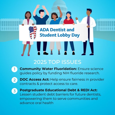 From March 30 to April 1, 2025, Georgia Dental Association representatives joined dentists nationwide in Washington, D.C. for the ADA Dentist and Student Lobby Day, advocating for key issues such as dental student debt relief, insurance reform, and water fluoridation.