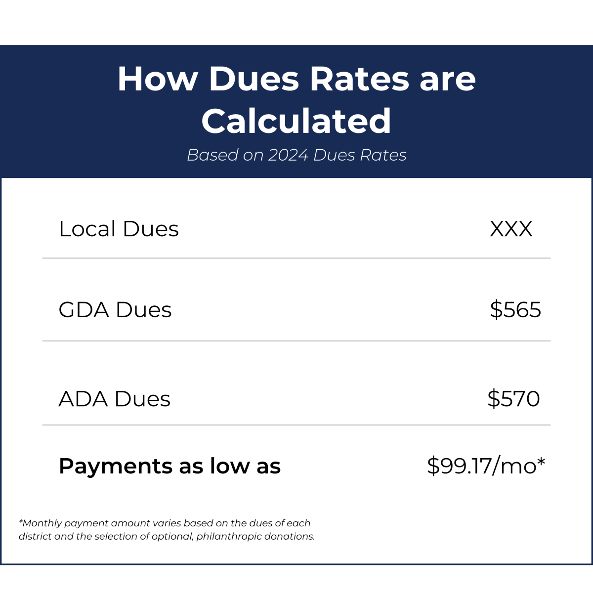 The rates shown are for Full Active Dues levels only. Please reach out to the GDA Membership Team or call 404.636.7553 for information regarding additional membership levels and reductions.